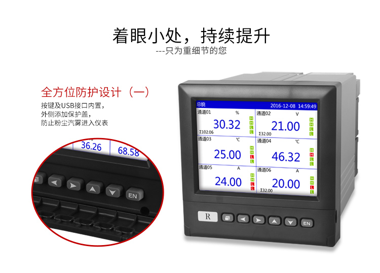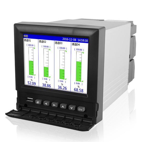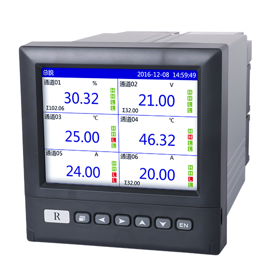 本产品为彩屏无纸记录仪采用高速、高性能32位ARM处理器和5.6英寸LED背光的320*240点阵式液晶显示屏,适用于现场各种压力,温度,流量等信号的检测,控制和记录。可自由组态输入标准电流、标准电压、热电偶、热电阻、频率等信号,可提供传感器配电和继电器报警输出,并采用U盘或通讯的方式与上位机进行数据交换。目前主要应用于冶金、石油、化工,建材、造纸、食品、制药,热处理、水处理等各种工业现场,是替代传统记录仪的新一代经济实用型无纸记录仪。