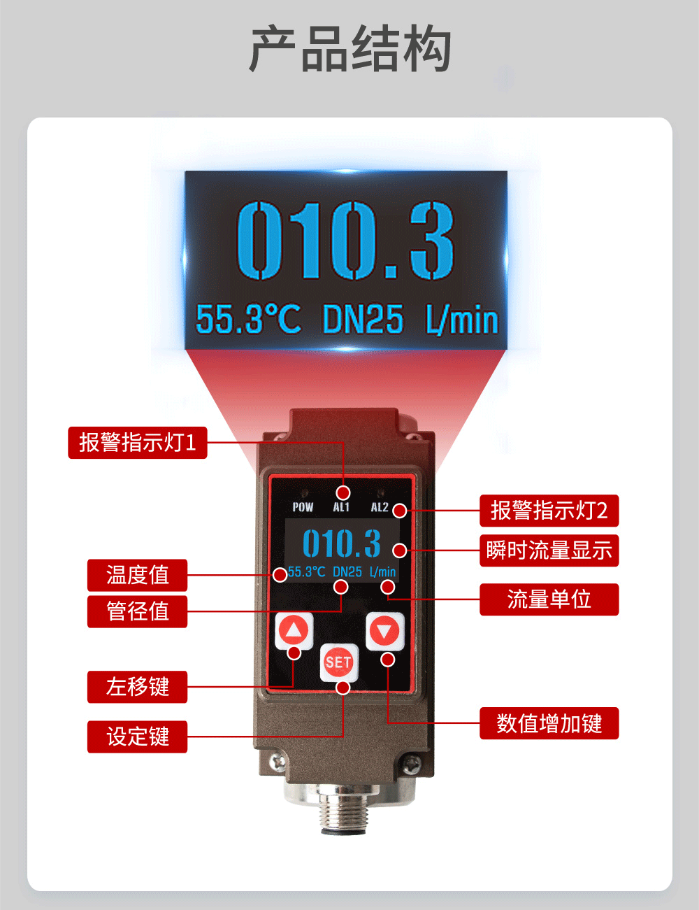 微型涡街流量计结构简单、精确度高、安装维修使用方便,可对管道中的液体流量及温度情况进行实时监控,支持流量和温度(4~20)mA 信号或 485 通信、报警开关输出,并采用 OLED 实时显示流体流量及温度,实现管道当中流量温度一体式的监控功能。本产品广泛应用于石油化工、电力、治金、钢厂、造纸、食口品加工、水处理、电池厂等行业。