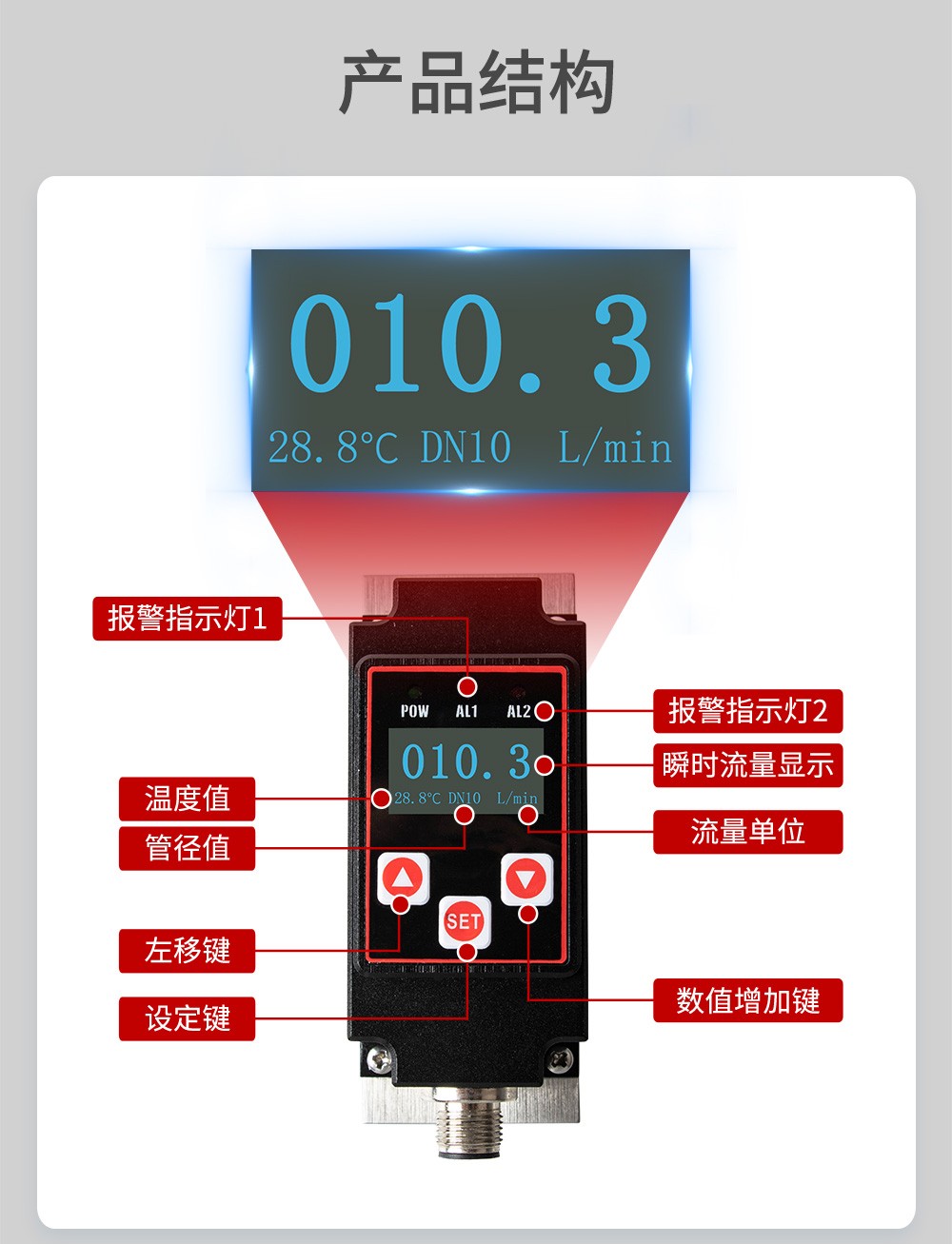 微型涡轮流量计结构简单、精确度高、安装维修使用方便,可对管道中的液体流量及温度情况进行实时监控,支持流量和温度(4~20)mA 信号或 485 通信、报警开关输出,并采用 OLED 实时显示流体流量及温度,实现管道当中流量温度一体式的监控功能。本产品广泛应用于石油化工、电力、治金、钢厂、造纸、食品加工、水处理、电池厂等行业。