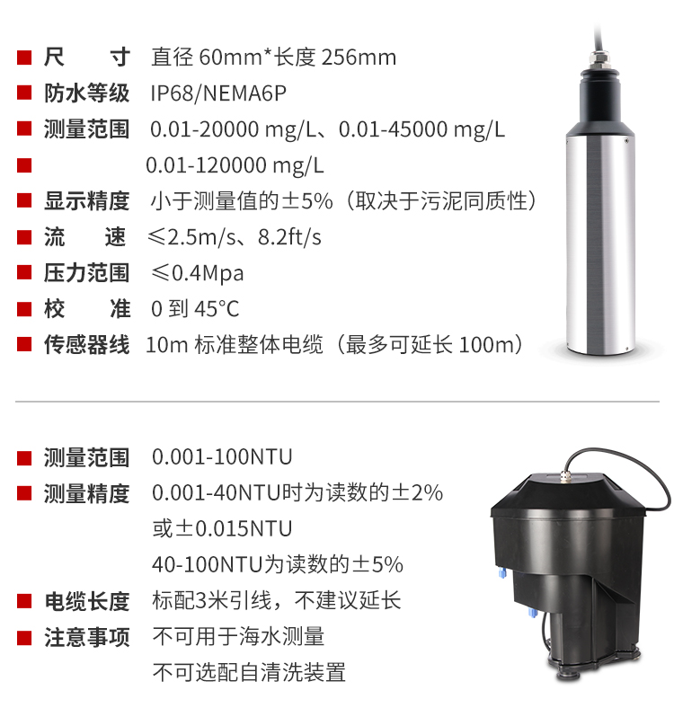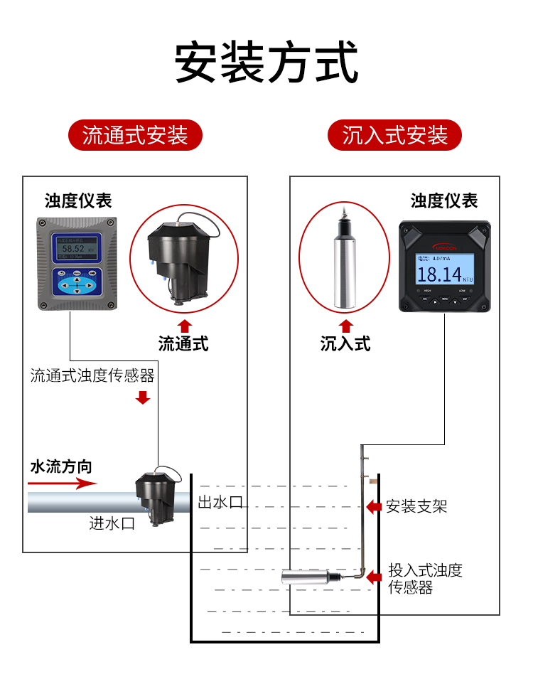 红外双散射光线技术不受色度影响测定浊度值。根据使用环境可以选配带自清洗功能。数据稳定,性能可靠;内设自诊功能,保证数据准确;安装和校正简单。